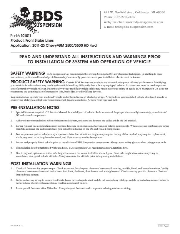 Improve safety and style by upgrading the front brake lines on your 2011-2026 Chevy Silverado or GMC Sierra 2500HD / 3500HD with a set of BDS front brake lines. Specially designed for vehicles with a 6-inch lift, these front brake lines are built with stainless steel braided hose and feature a kevlar liner for an improved brake pedal feel.