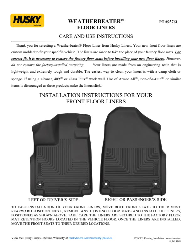 - WeatherBeater(TM) Liners offer protection that extends all the way to your rear seats. So go ahead, lift the seats and leave them up, load after load. Husky's got your floors, and your back, no matter what the road brings your way.