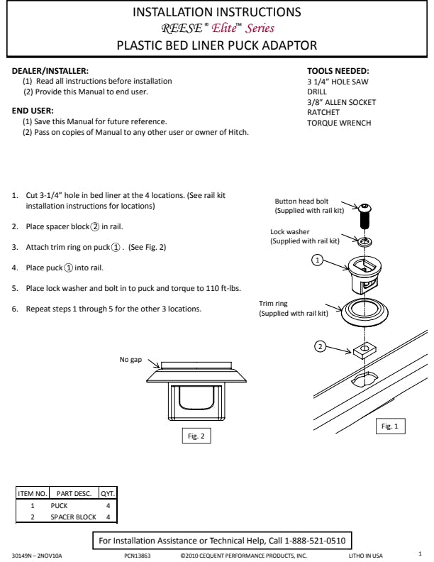 Elite Series Rail Kit Accessory; Plastic Bedliner Puck Adapter Kit Incl. 4 Pucks; 4 Spacers;