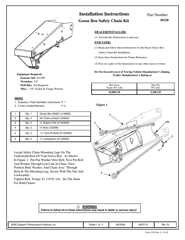 Safety chains conform to J684.6.3.4 SAE standardsMounting hardware included Limited 5 Year Warranty