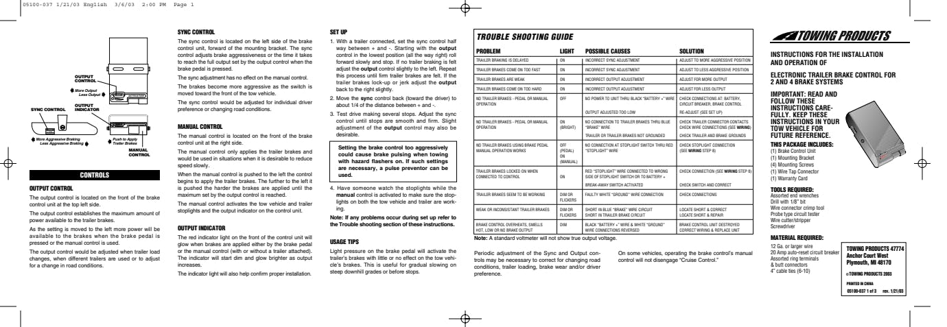 1 to 2 axle trailersIlluminated LED output indicator Slide adjustment output control "Up- front" manual over-ride control Mounting hardware included Smooth and simple installationPlug & Play feature allows quick and easy connection5 year limited warranty
