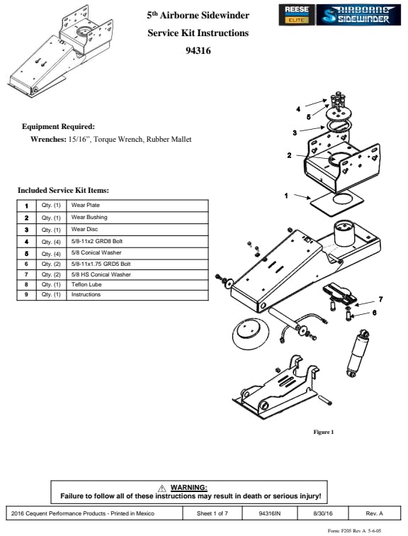 Hitch Rebuild Kit; For Fifth Airborne Sidewinders; Incl. Teflon Lube; Wear Plate; Wear Bushing; Wear Disc; Wedge Fasteners; Turret Tube Fasteners;