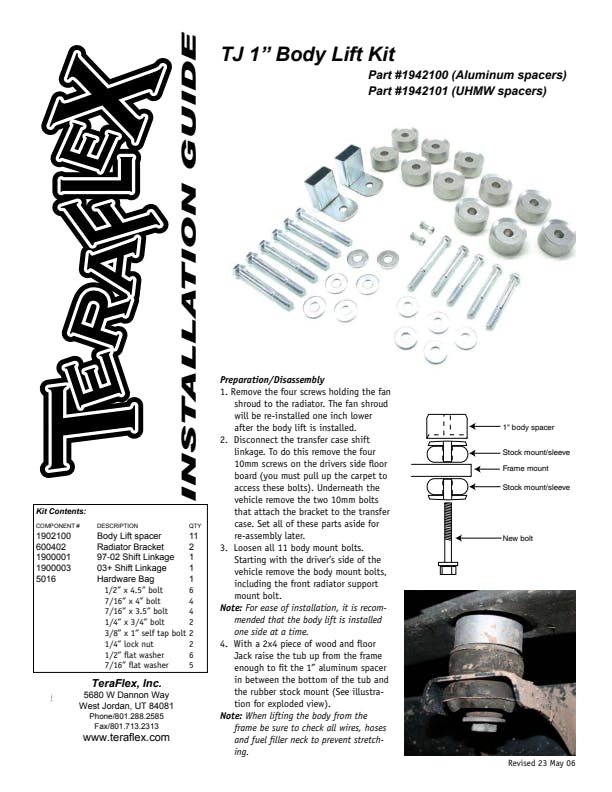 1? Body Lift Spacers - Aluminum - 11, Radiator brackets - pair, 1997-2002 TJ: Shift Linkage Plate Kit (# 1900001), 2003-2006 TJ: Shift Linkage Plate Kit (# 1900003), All necessary hardware |