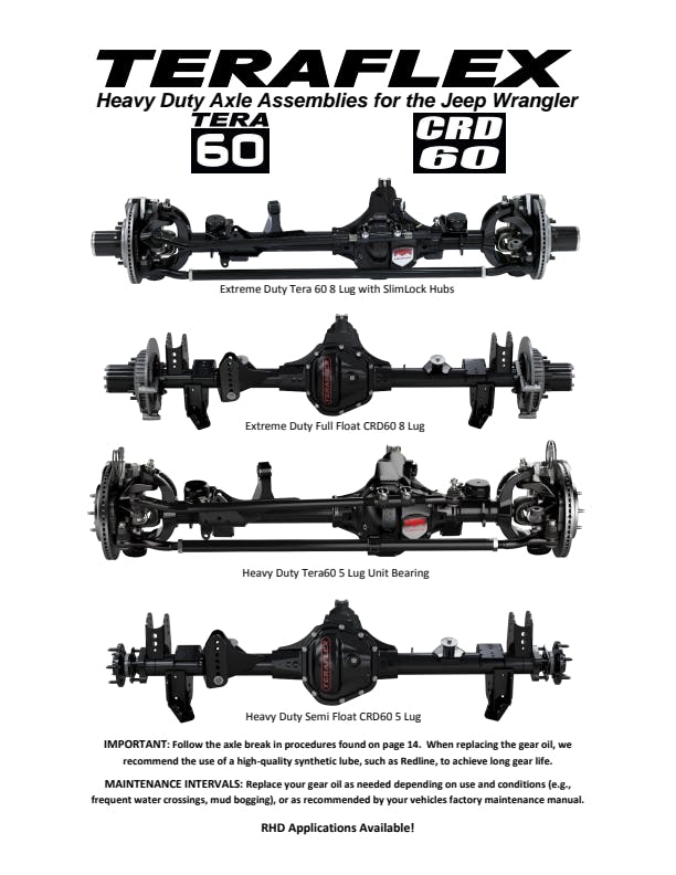 The unloaded Tera CRD60 HD Rear Axle Assembly w/ Full-Float includes full-float outer axles, Super 60 bearings, inner axle shafts, and sensors. Add your choice of ring and pinion gear ratio, locker, and carrier. TeraFlex Tera CRD60 HD Rear Axle Housings are perfect for replacing bent, broken, or damaged axles in JK Wrangler/Unlimited vehicles including Rubicon models. Can also be used as a direct bolt-on upgrade for Jeep owners looking to beef up the stock axles? weak areas. The exclusive Constant Radius Design (CRD) provides high ground clearance that is unaffected by pinion angle adjustments. Compatible with all Super 60 gear ratios for extreme duty applications requiring additional ring and pinion strength. Our heavy-duty axle housings feature smooth profile surfaces, axle tubes, all necessary mount brackets, control arm bushings, and more!