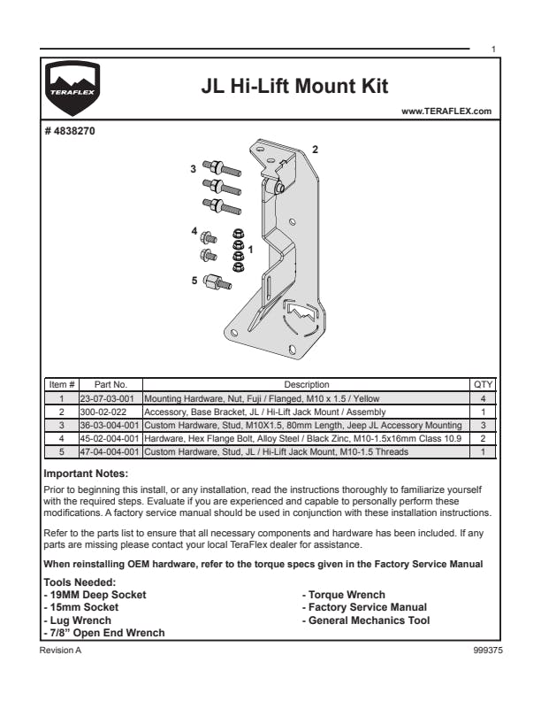 Hi-Lift Jack Mount Bracket, All necessary hardware |