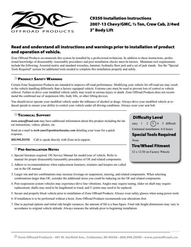 Improve the styling of your Chevrolet/GMC 1500 truck while maintain the ride quality and handling characteristics with this 3" body lift from Zone Offroad. This kit raises the body and bumpers up off the frame to allow clearance for larger tires while maintaining factory body lines. It includes indestructible body mount blocks, high quality hardware, steering extension, bumper brackets, radiator brackets, bed support spacers, e-brake relocation and more.