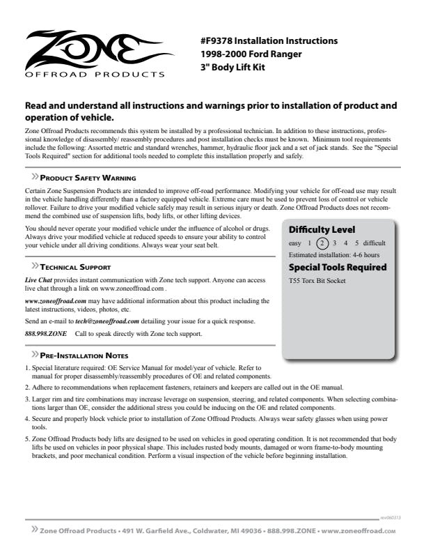 Improve the styling of your Ford Ranger while maintain the ride quality and handling characteristics with this 3" body lift from Zone Offroad. This kit raises the cab, bed and bumpers up off the frame to allow clearance for larger tires. It includes indestructible body mount blocks, high quality hardware, steering extension, bumper brackets, radiator brackets, bed supports, fuel filler extension and more.
